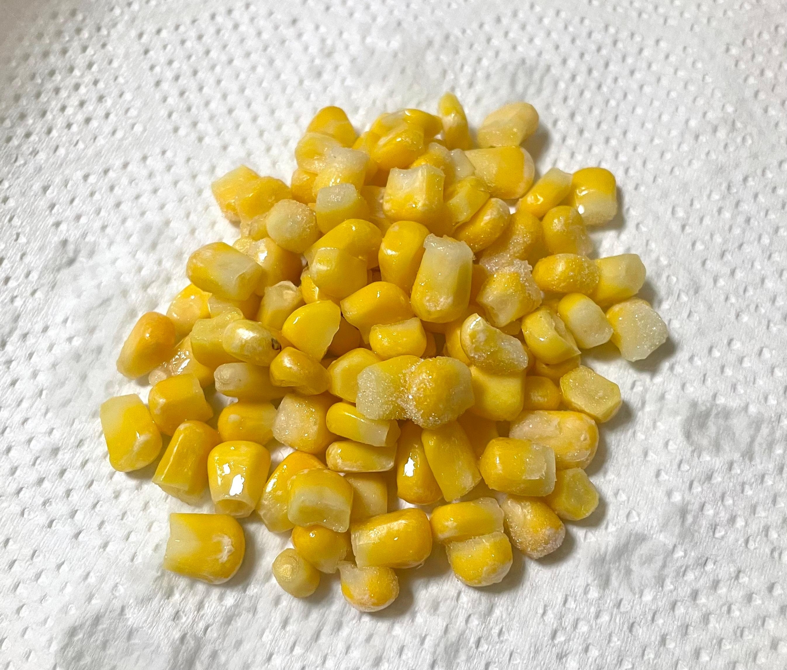 冷凍コーンは解凍しキッチンペーパーを使い水分を拭き取ります。