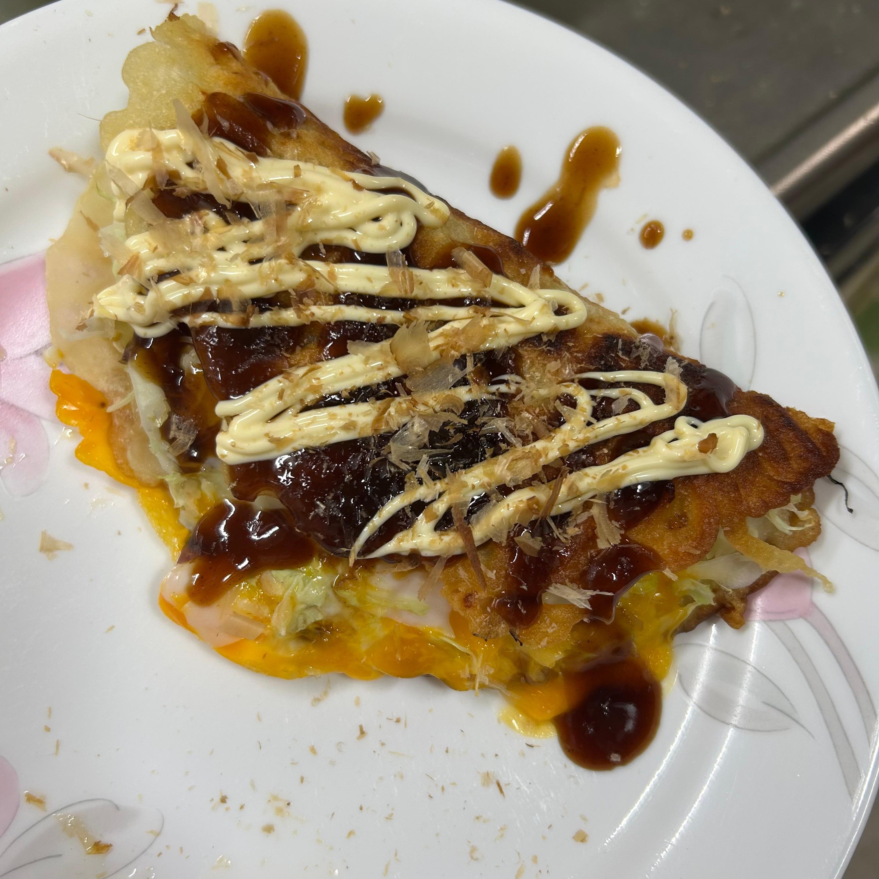 焼き上がったら半分に折りソース、マヨネーズ、かつお節をかける