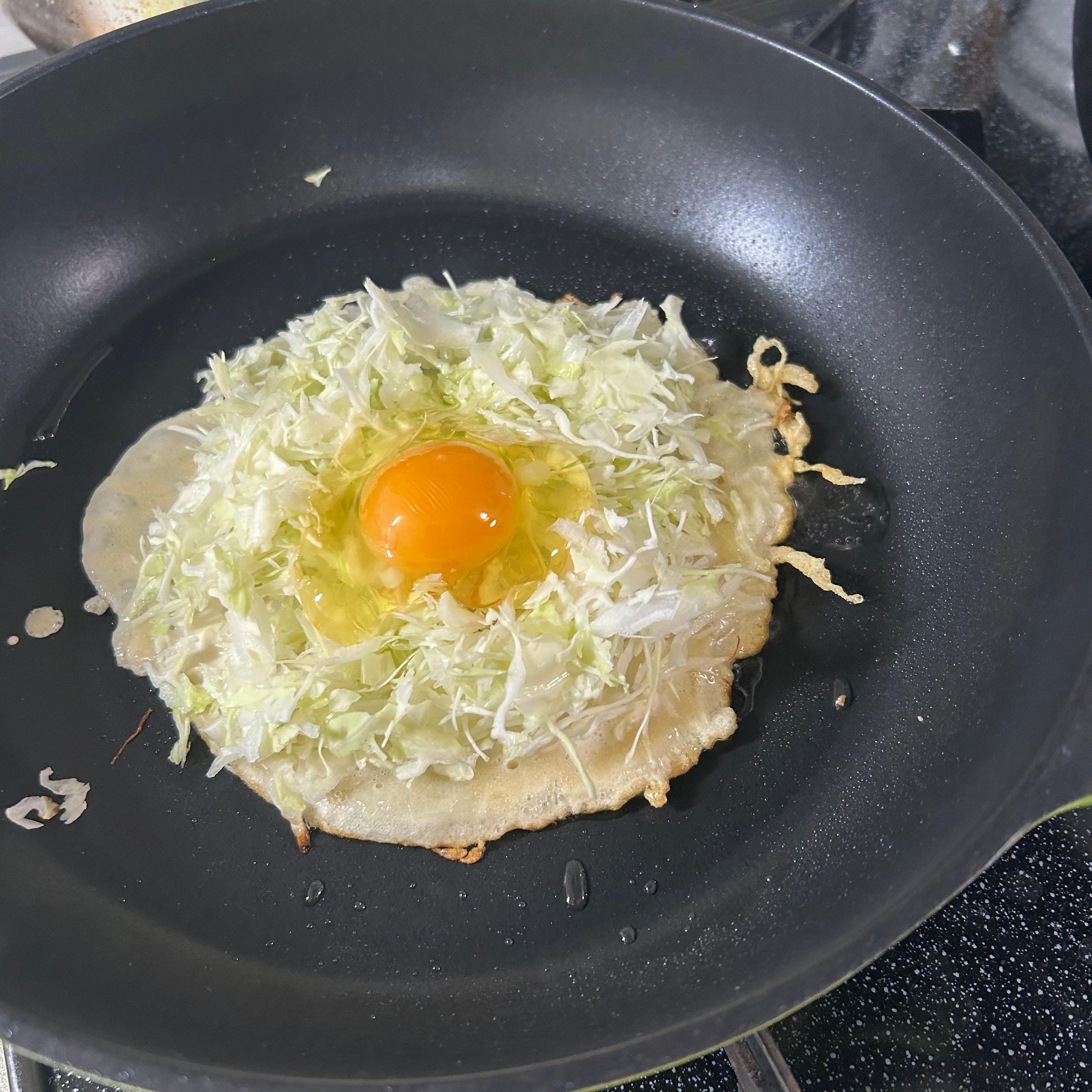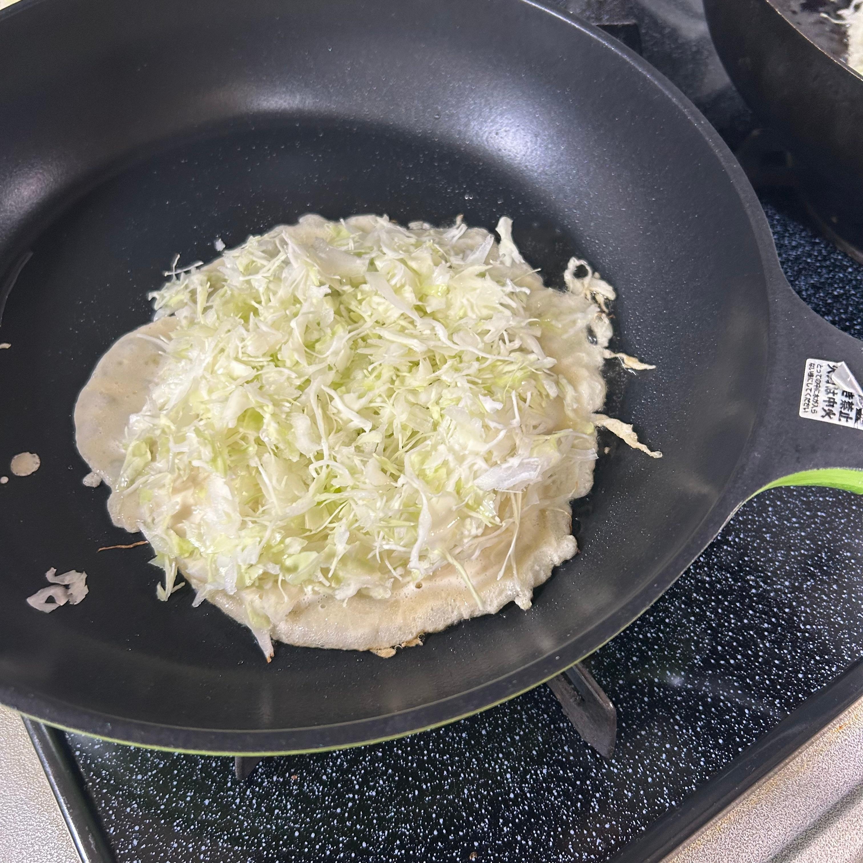 サラダ油を熱したフライパンに生地を薄くひきキャベツをたっぷり乗せる