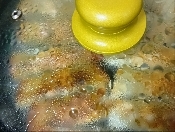 ポットの湯をひとまわし入れて、蓋フタします