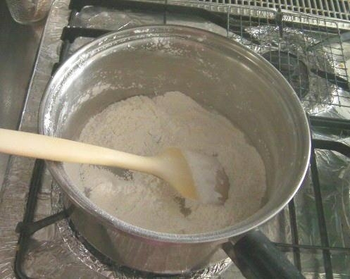 もち粉と上新粉を合わせて鍋底に広げる。