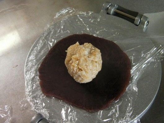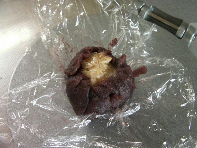 上のラップを剥がして餡をのせ、下のラップで茶巾状に包む。