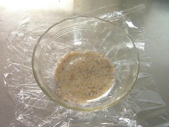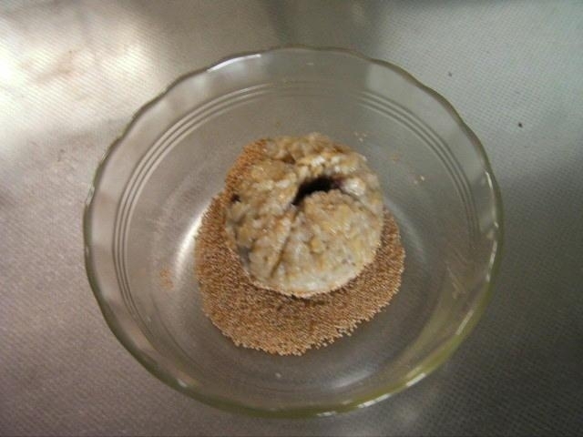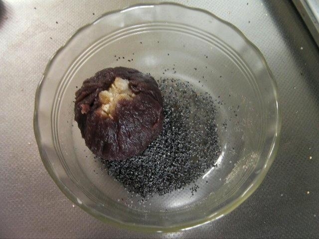 ラップから取り出して小さいボウル※にけしの実と包餡した生地を入れ、ゆすりながら表面にまぶしつける。