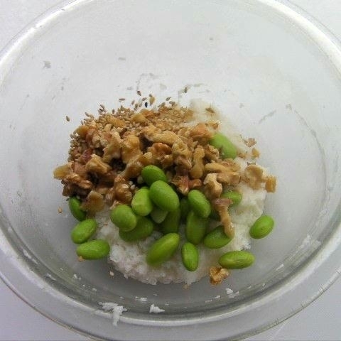 クルミ、むき枝豆、白ごまを加え、さらに電子レンジで加熱する。