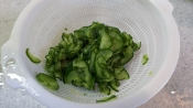 きゅうりを薄い輪切りにして、塩を加えて良く揉み絞り、水気をしっかりと出したら流水で塩分を流して再び良く絞る。