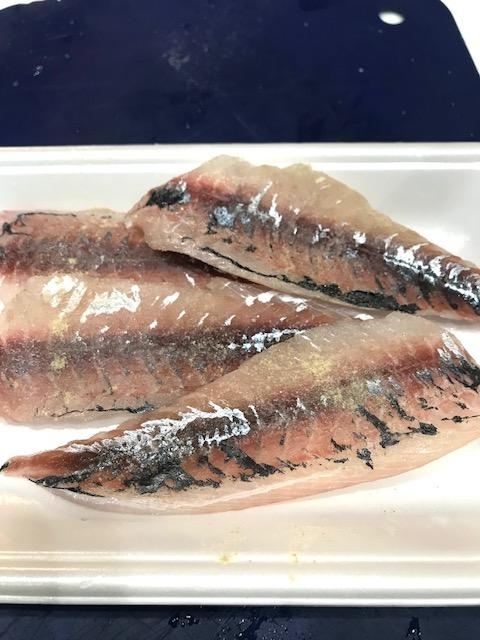 キャベツを千切りにして、水にさらしておきます。三枚おろしのアジの皮を取り、両面に塩コショウをして10分置きます。アジの身に適度に塩気が入り、生臭さを感じにくくなります。