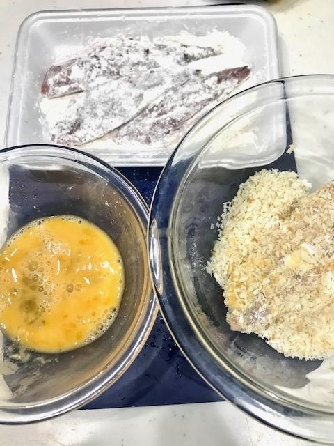 小麦粉をまぶし、卵、パン粉の順に衣をつけていきます。