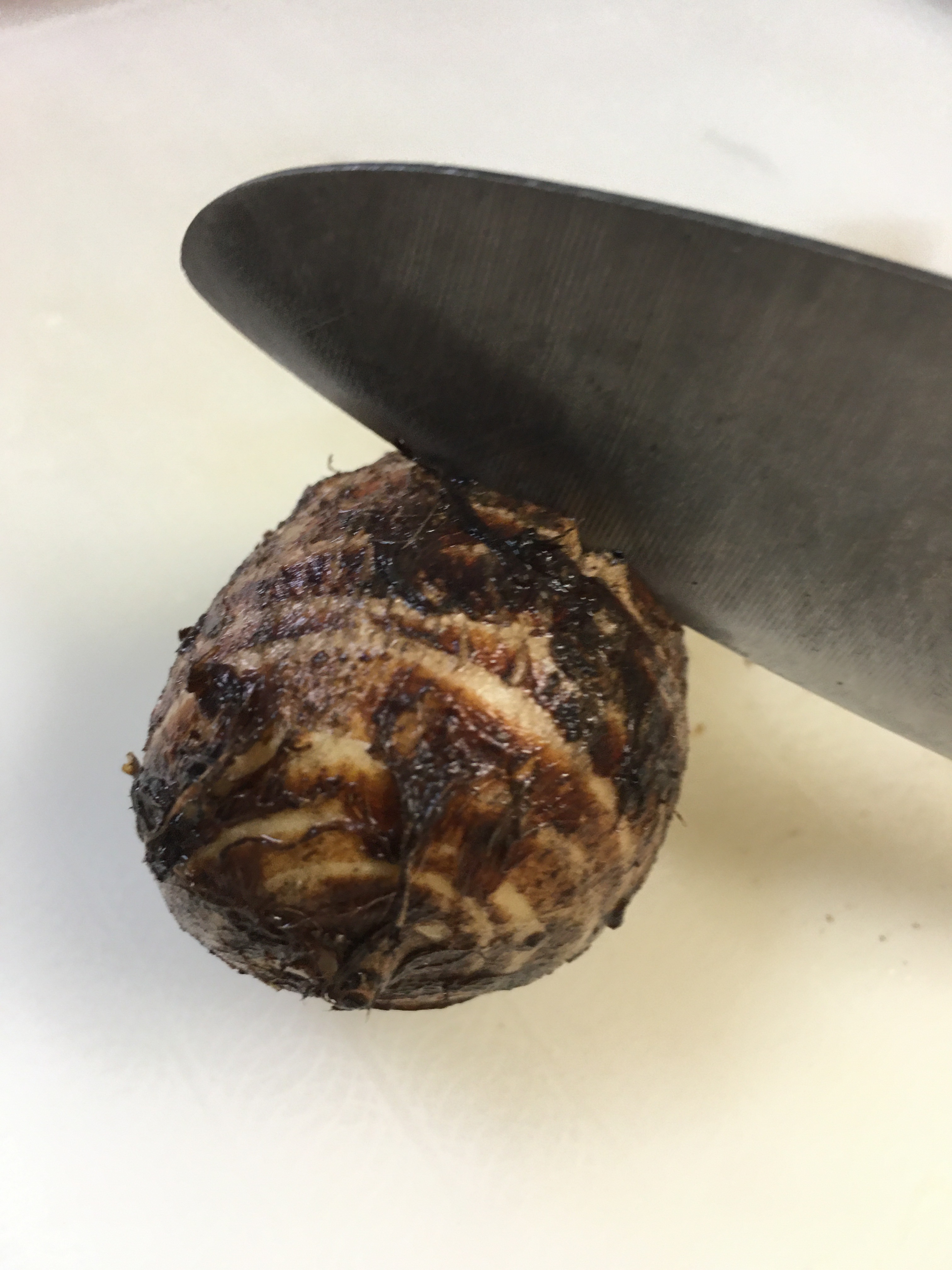 洗った里芋の真ん中に、ぐるりと1周、皮だけに切り目を入れる。