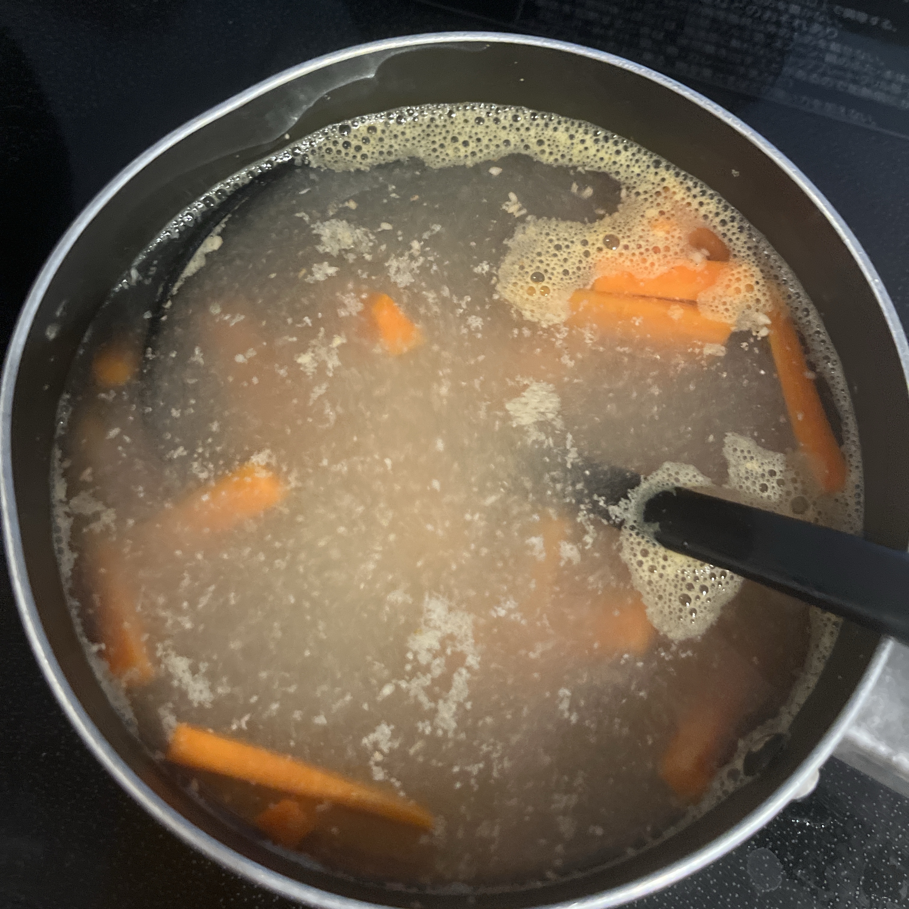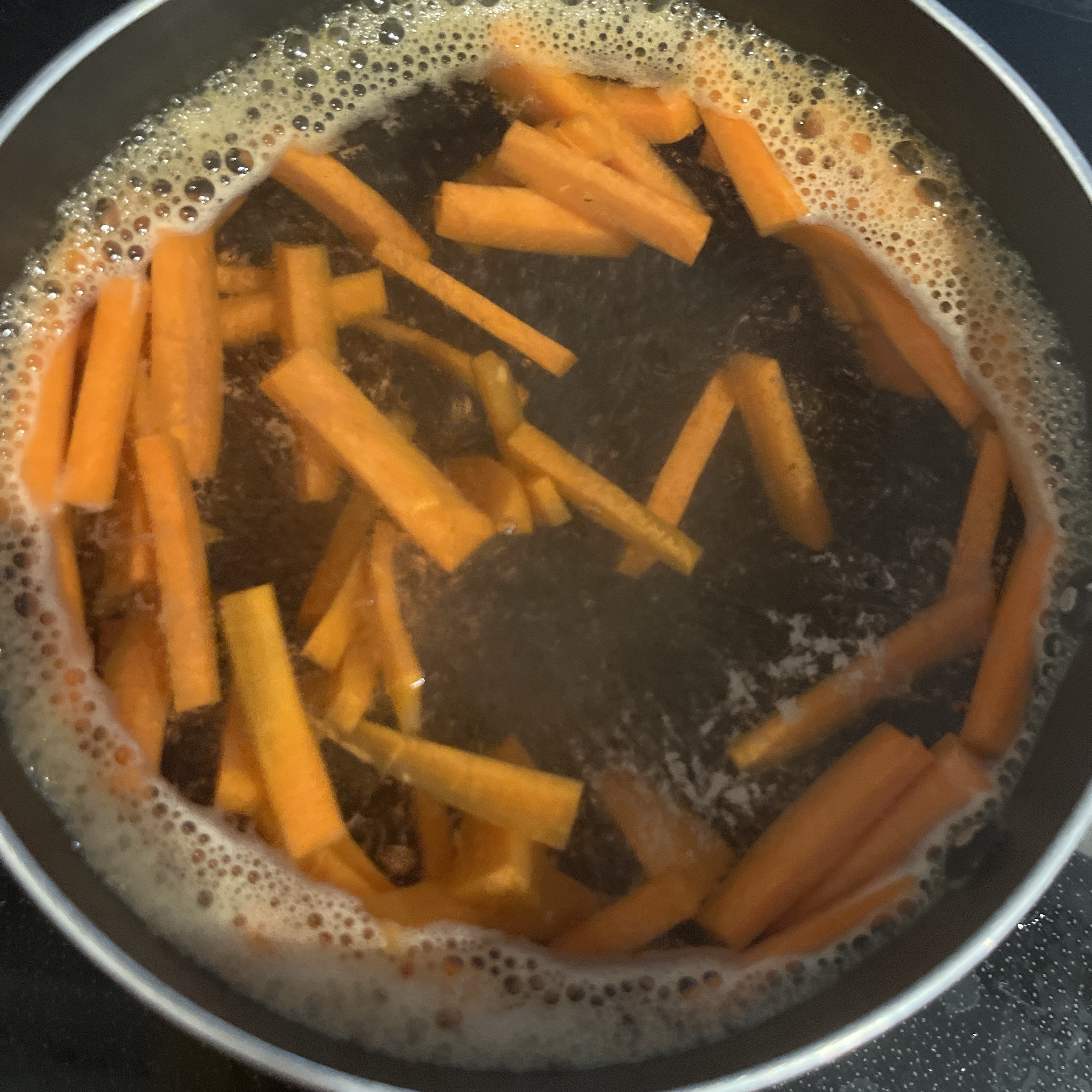 にんじんの皮を剥き、食べやすいサイズに切る。沸騰した鍋ににんじんとレンズ豆100gを入れて8分ほど茹でる。