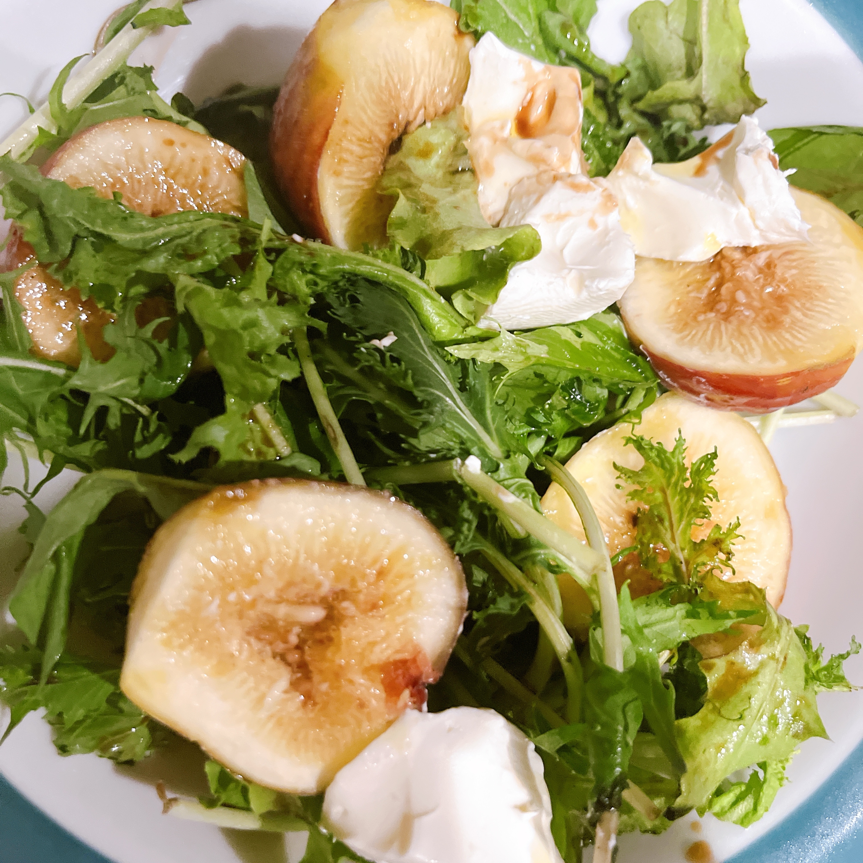 - 2 ベビーリーフを器に盛る。いちじくとクリームチーズ を散らす。
