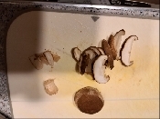 しいたけは、石づきを切り落とし、傘と軸をに分けて、それぞれ薄切りにする。