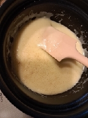 2の鍋を弱火にし、1を3回に分けて入れ、ゴムべらで、そのつど よく混ぜる。
