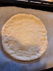 ピザ生地は、ふちが盛り上がるように めん棒で直径20cmくらいに のばす。