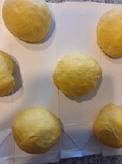 1個ずつ1のオーブンペーパーにのせて天板に並べ、電子レンジの発酵機能(40℃)で15分 二次発酵させる。