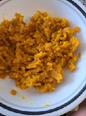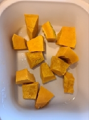 かぼちゃは、皮、種、ワタを取り除き、一口大に切る。