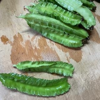 四角豆は洗って、写真のように両端を取り除き、半分に折る。(包丁を使わなくても平気です)
