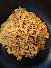 フライパンを中火で熱し、ごま油(大さじ1/2)を入れて、2を流し入れ、丸く形を整え、弱めの中火にし、焼き色がつくまで焼く。