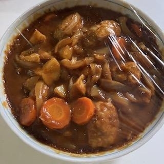 「2」に焼き肉団子・熱湯を入れ(野菜から出る水分を見ながら増減する)、カレールーをのせたら菜箸等で軽く混ぜながらルーを溶かし、再度ラップをしたら80℃に設定してレンチンする。