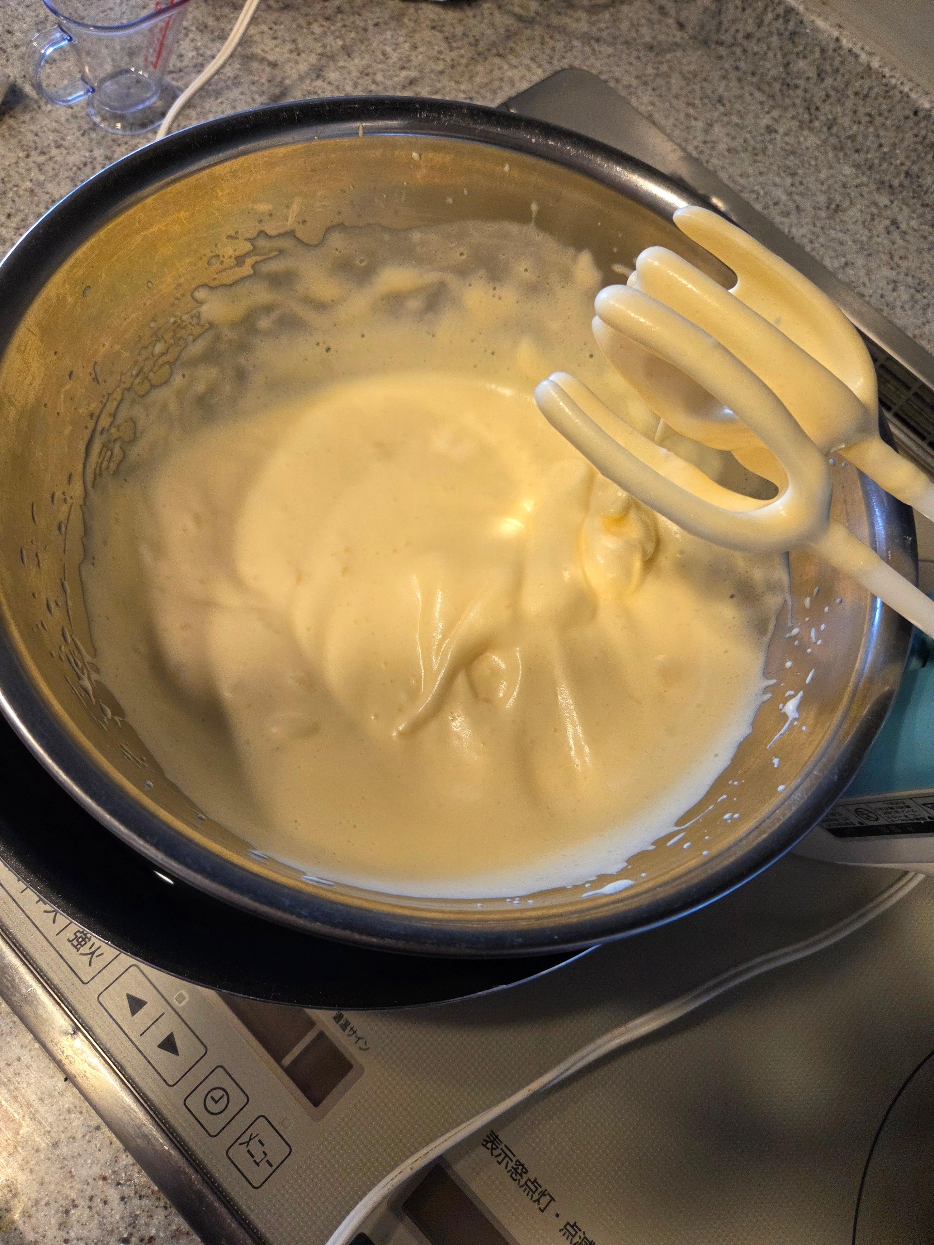 最後は、低速で なめらかになるまで、泡立てる。