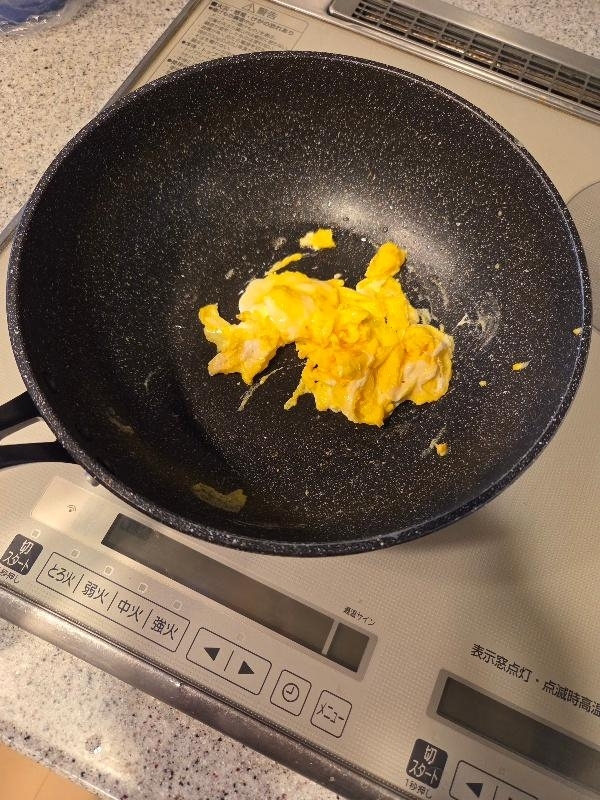 フライパンにサラダ油を入れて中火で熱し、溶いた卵を入れて、大きく混ぜ、半熟状態になったら、ご飯を加えて炒める。