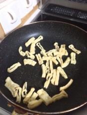 油揚げを食べやすい大きさに切り、別のフライパンでカリカリに焼く。(油は敷かない)