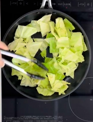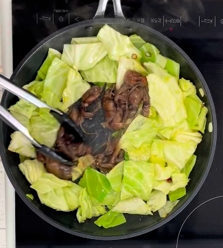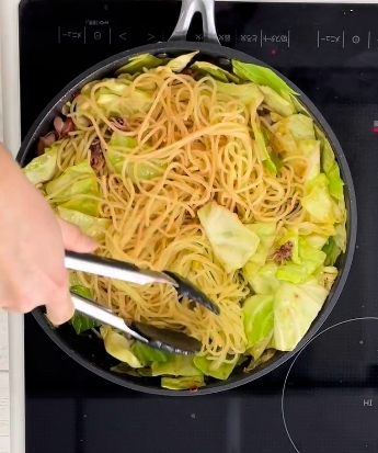 スパゲッティ、茹で汁を加え、全体に味が馴染むまで混ぜながら炒める。仕上げに塩こしょうで味を調えて完成。