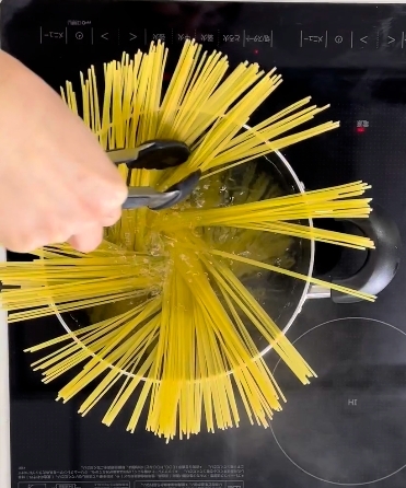 鍋にお湯を沸かし、塩を加え、スパゲッティを表示時間より1分早めに茹でる。この時ゆで汁を大さじ2取っておく。