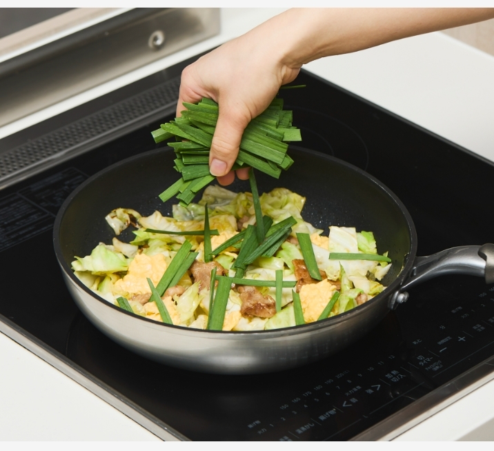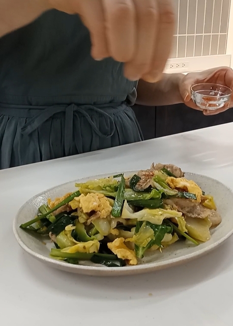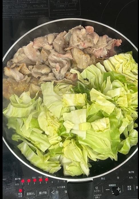 (豚肉に少し色がつけば、キャベツをいれると〇)