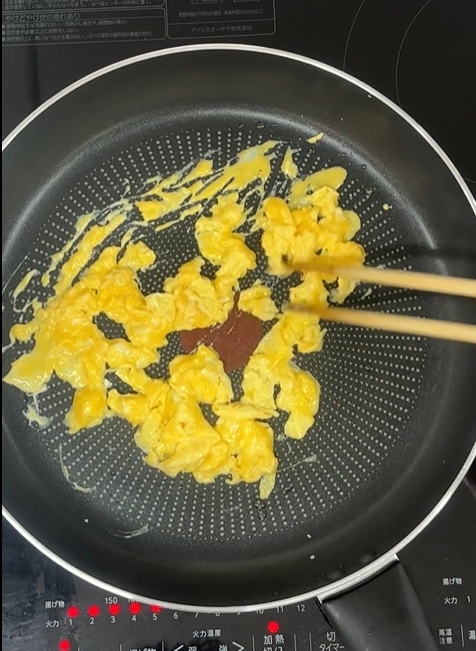 Bをいれ、味がなじんだら、ニラと①の炒り卵をいれ、さっと火を通したら完成。