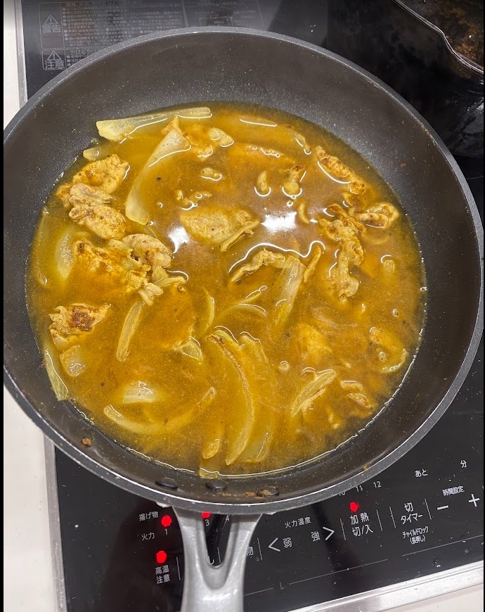 玉ねぎがしんなりしてきたら端に寄せ、空いた場所に豚小間肉を入れ焼き、少し焼き色がついたら、Aをふりかけさらに炒める。
