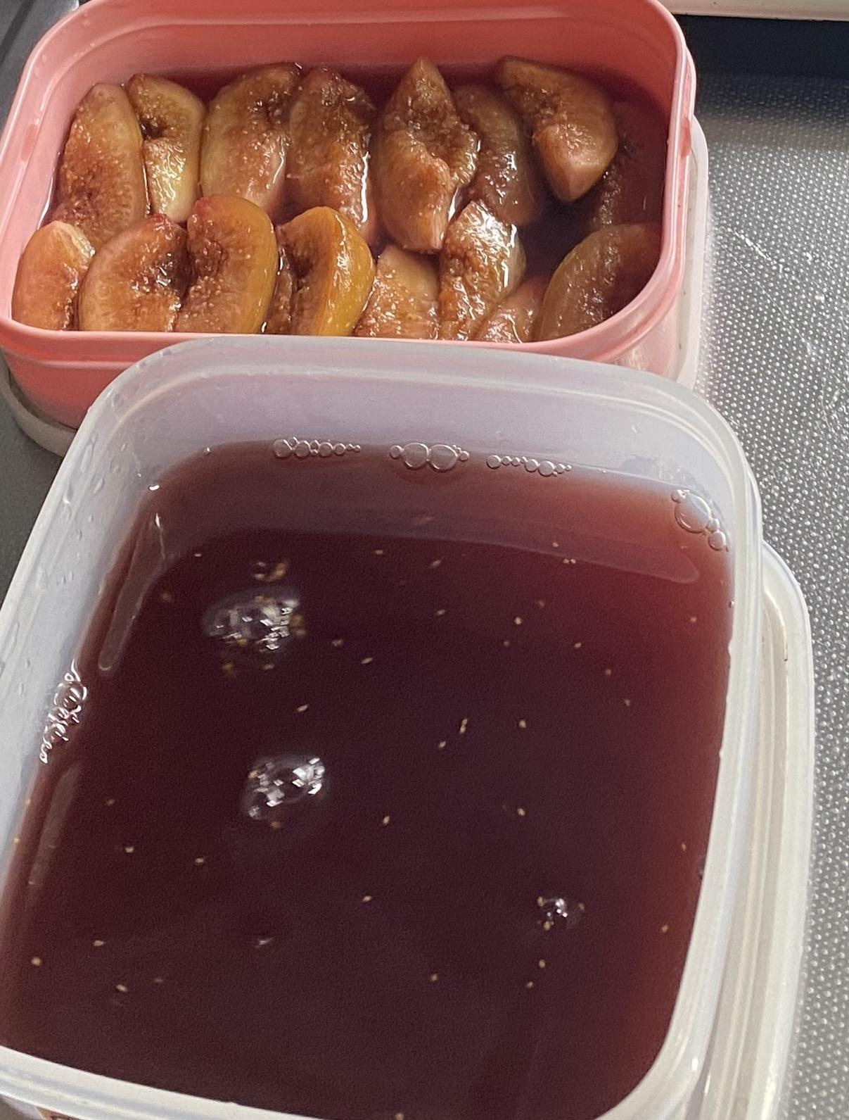 イチジクを戻してゼリーを絡め、再び取り出して容器に入れる。汁は別の容器に入れる。