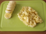 バナナを用意します。飾り用のバナナとして6枚スライスしたら、残りは細かく刻みます。
