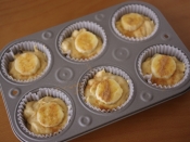 オーブンを170度に予熱し始めます。型に生地を6等分に流し入れ、上に飾り用のバナナをのせます。好みでシナモンシュガー(分量外・シナモンでもok)をふりかけます。