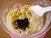 2のバナナを細かくしたものとチョコチップを1の生地に混ぜ込みます。