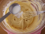 やわらかくした無塩バターにブラウンシュガーを混ぜ、卵を入れてさらに混ぜます。ホットケーキミックスを入れて混ぜたら、牛乳を加えてよく混ぜます。