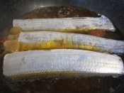 沸騰したら、魚を入れ、何度か煮汁を魚にかけます。