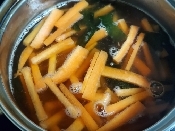 鍋に水を中火で熱し、鶏ガラスープを溶かす。乾燥わかめ、ソーセージ、にんじんを加えて2分煮る。