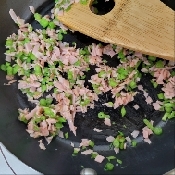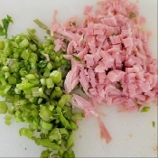 クレソン茎とベーコンをみじん切りにする。