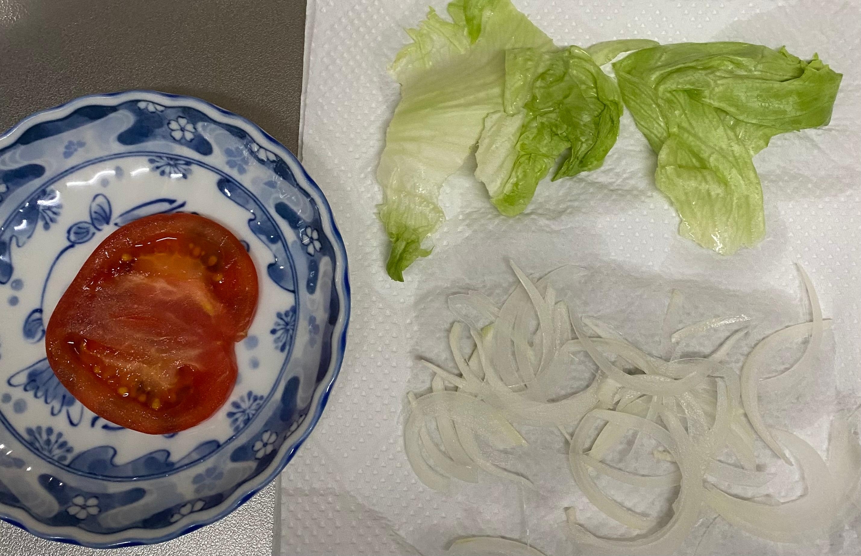 玉ねぎを薄くスライスしレタスと共に水に5〜7分程さらしキッチンペーパーなどでしっかり水分を取ります、トマトを1枚スライスしておきます(縦スライスでも横スライスでもOK)