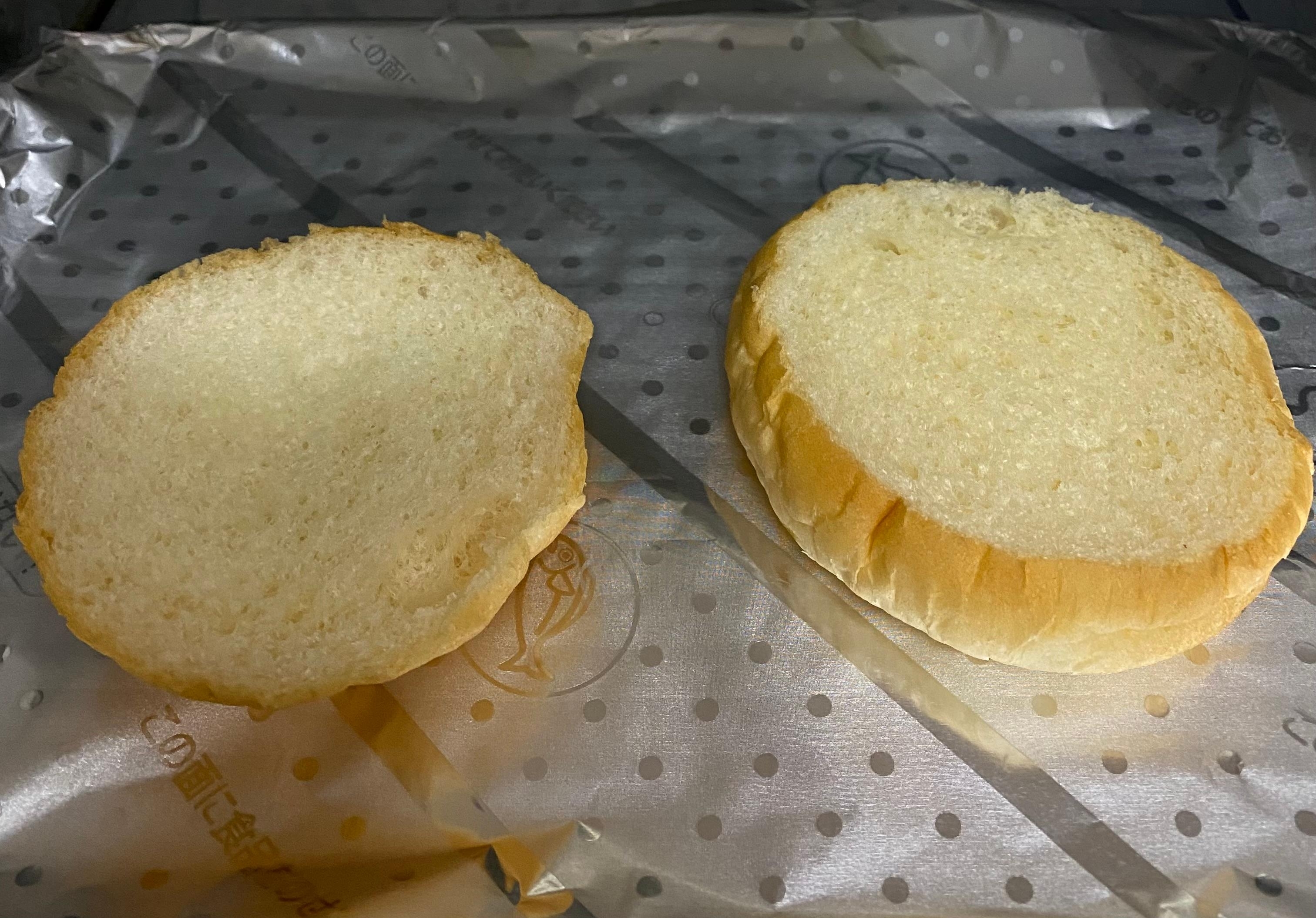 バンズの白いほうを上にオーブントースター1200Wで3分程焼きます