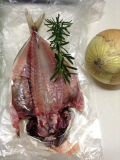 アルミホイルを長めに切り、あじを乗せ、玉ねぎ、ローズマリーを乗せ、塩コショウをふり、アルミホイルで包みます。