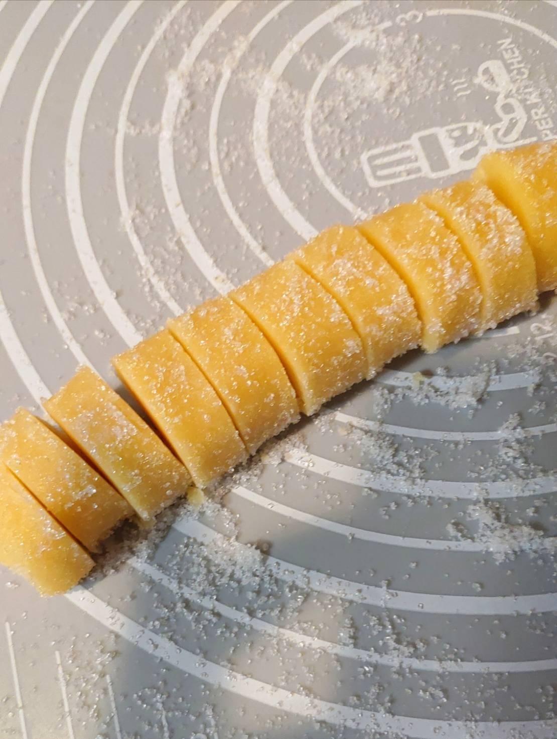 生地を冷蔵庫から取り出し、転がしながらグラニュー糖を表面にまぶし、約1cm幅に切る。