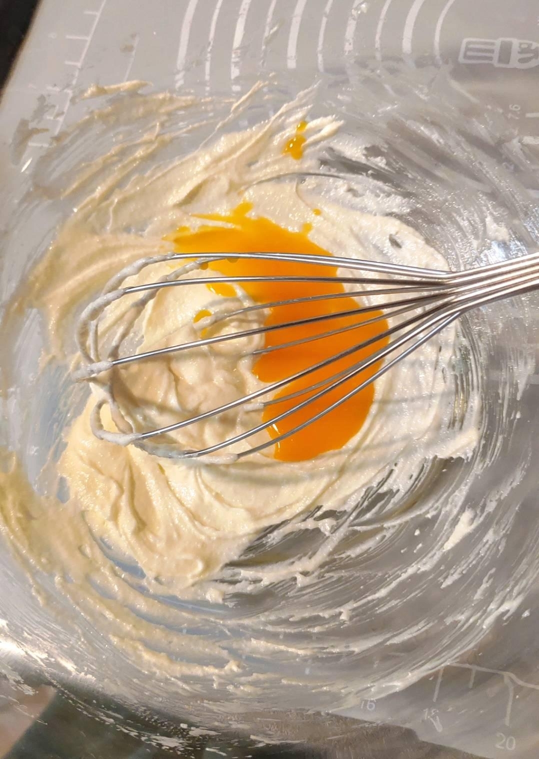 卵黄とバニラオイルを加え、混ぜ合わせる。