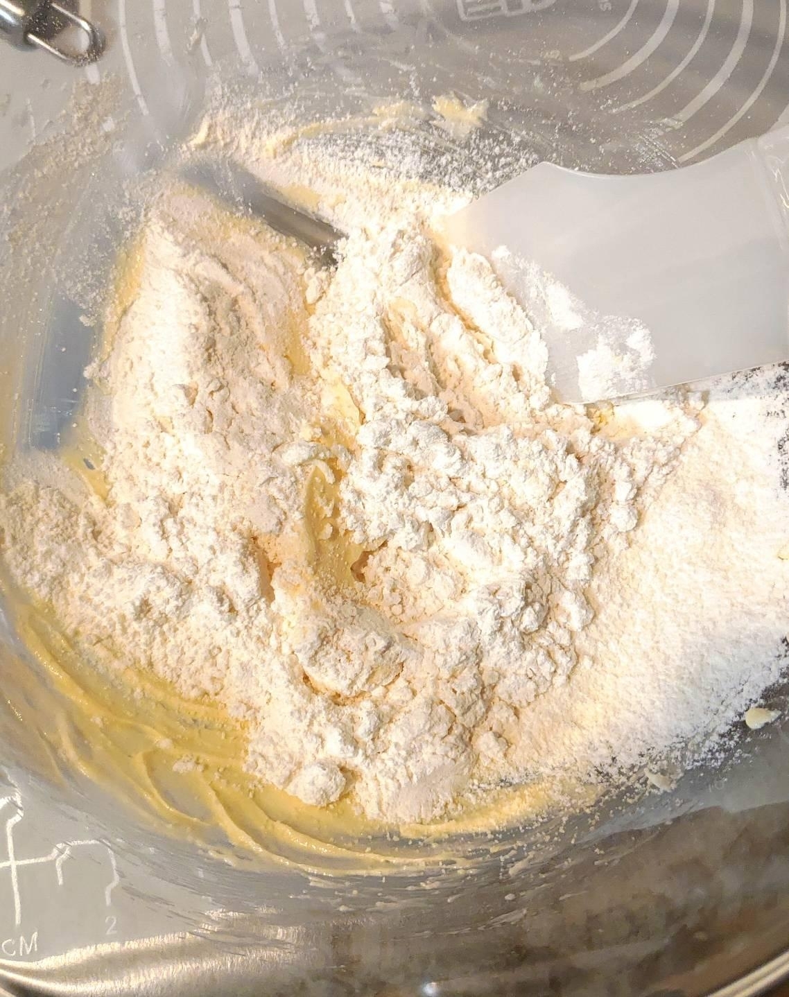 粉類をふるい入れ、ゴムベラで切るように混ぜる。