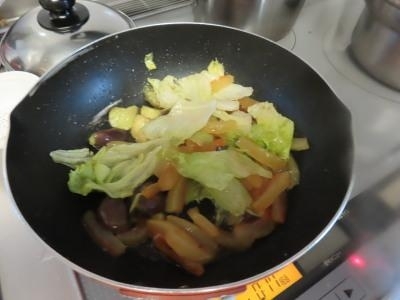スイカの皮の火の通りが悪いので、先に炒めましたが、ナスを大きめに切った時は、同時に炒めても良いと思います。