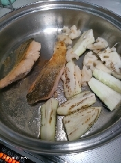フライパンを中火に温めサラダ油をひいて①の鮭の皮を下に焼き両面をこんがり焼き、れんこんとナスを加えて炒め器に盛り付ける。