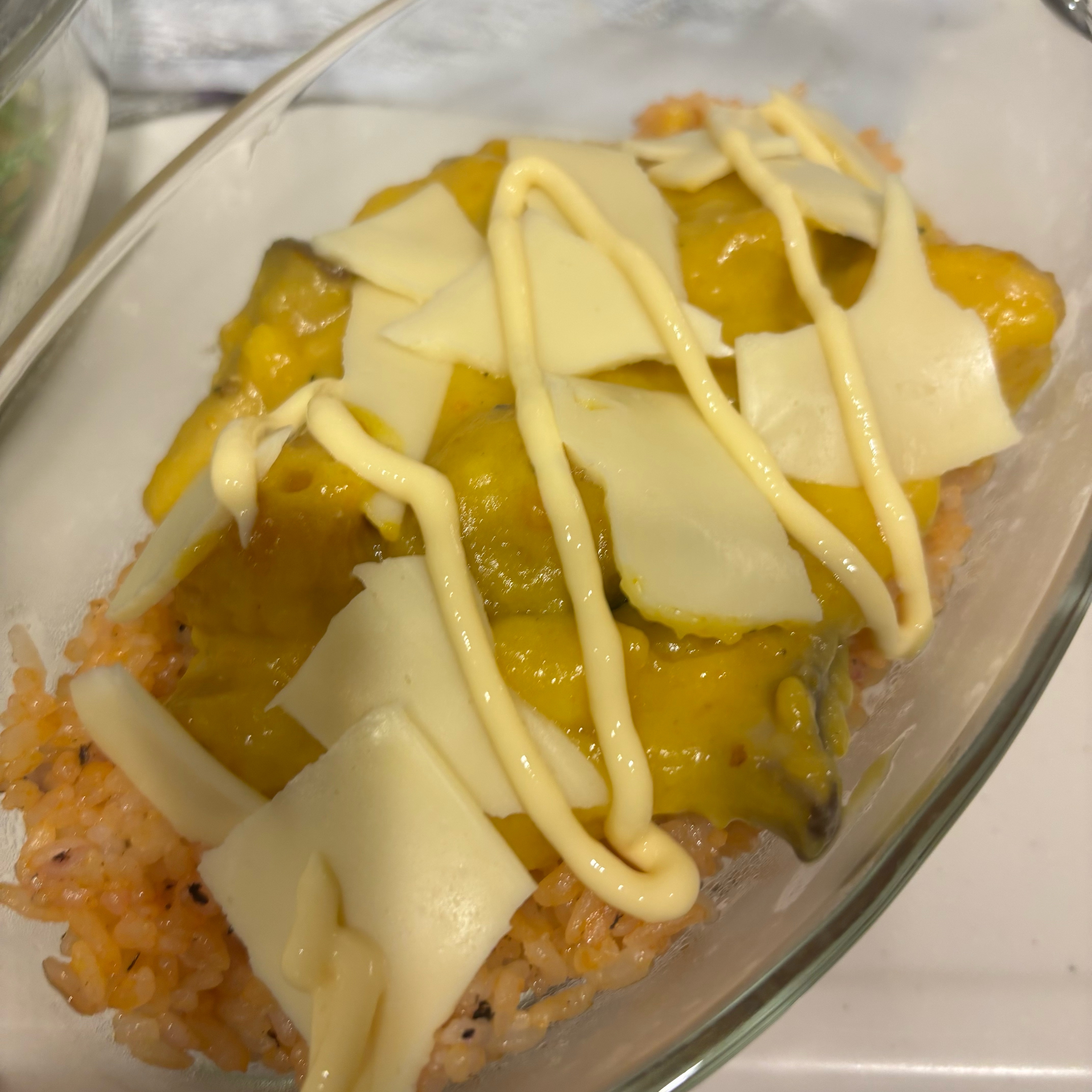 耐熱皿にケチャップライス、シチューを盛り、スライスチーズ、マヨネーズをかけて焼き色がつくまでトースターで焼く