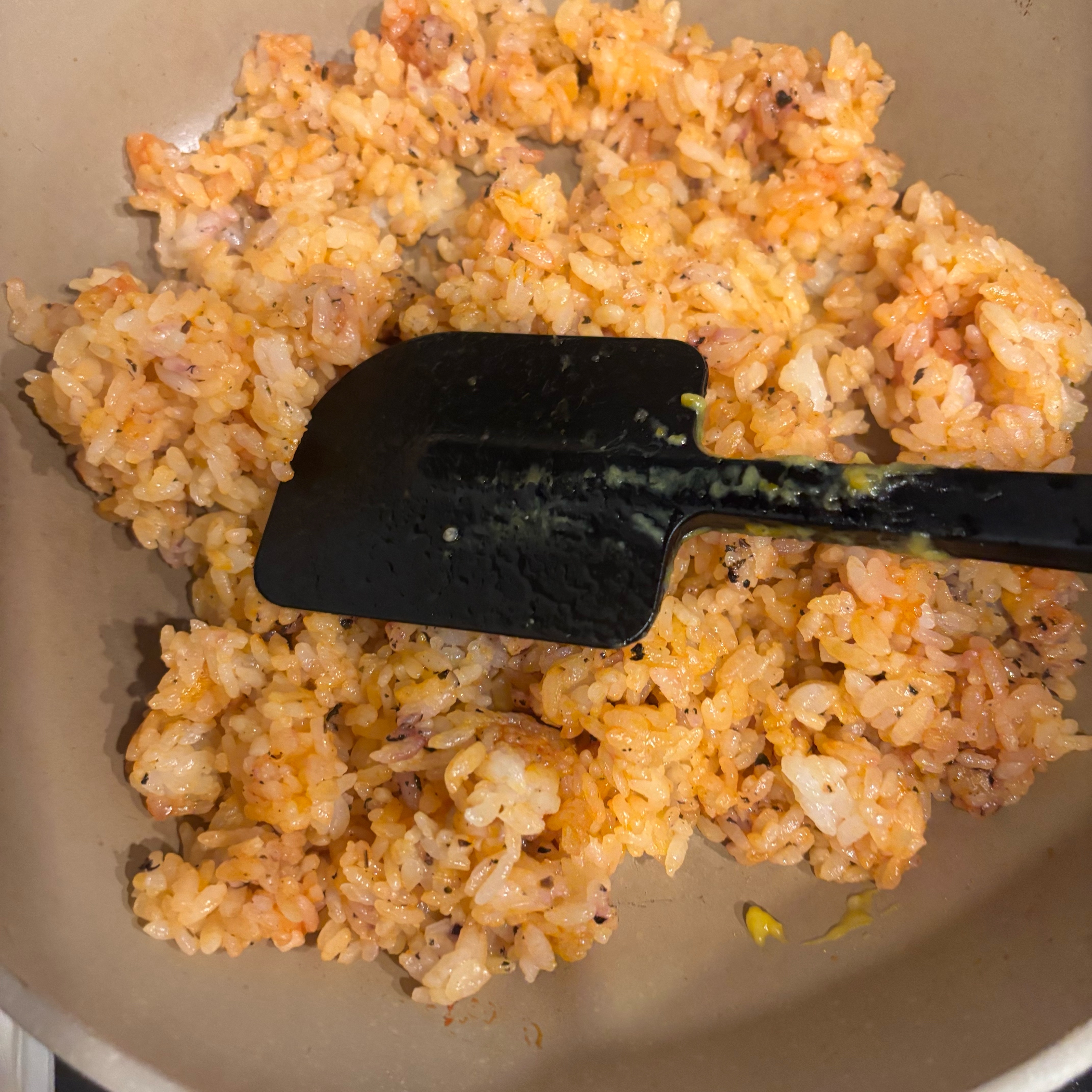 ご飯をバターで炒め、ケチャップを加えてよく絡めます