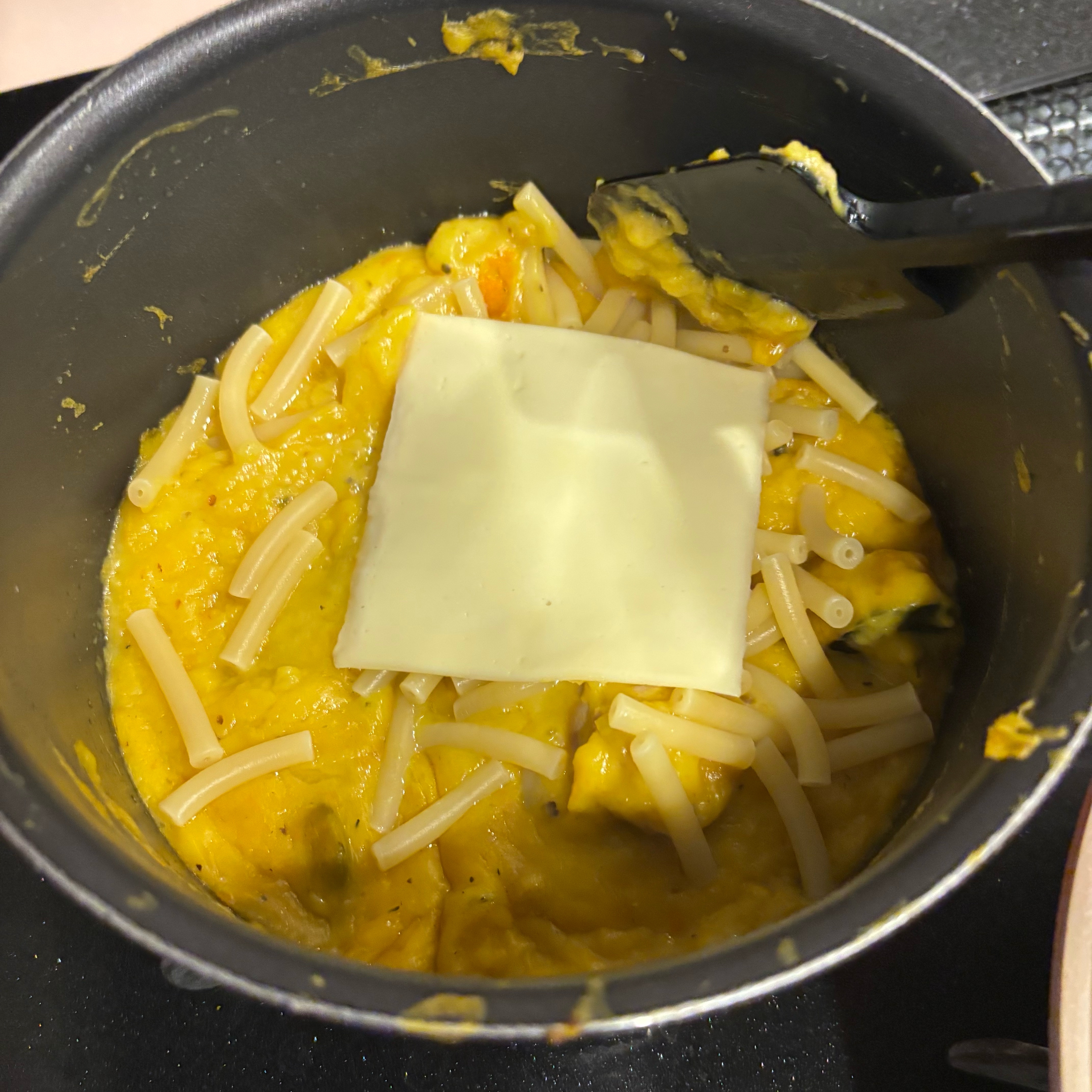 温めたシチューにマカロニ、スライスチーズを入れてチーズが溶けるまで加熱