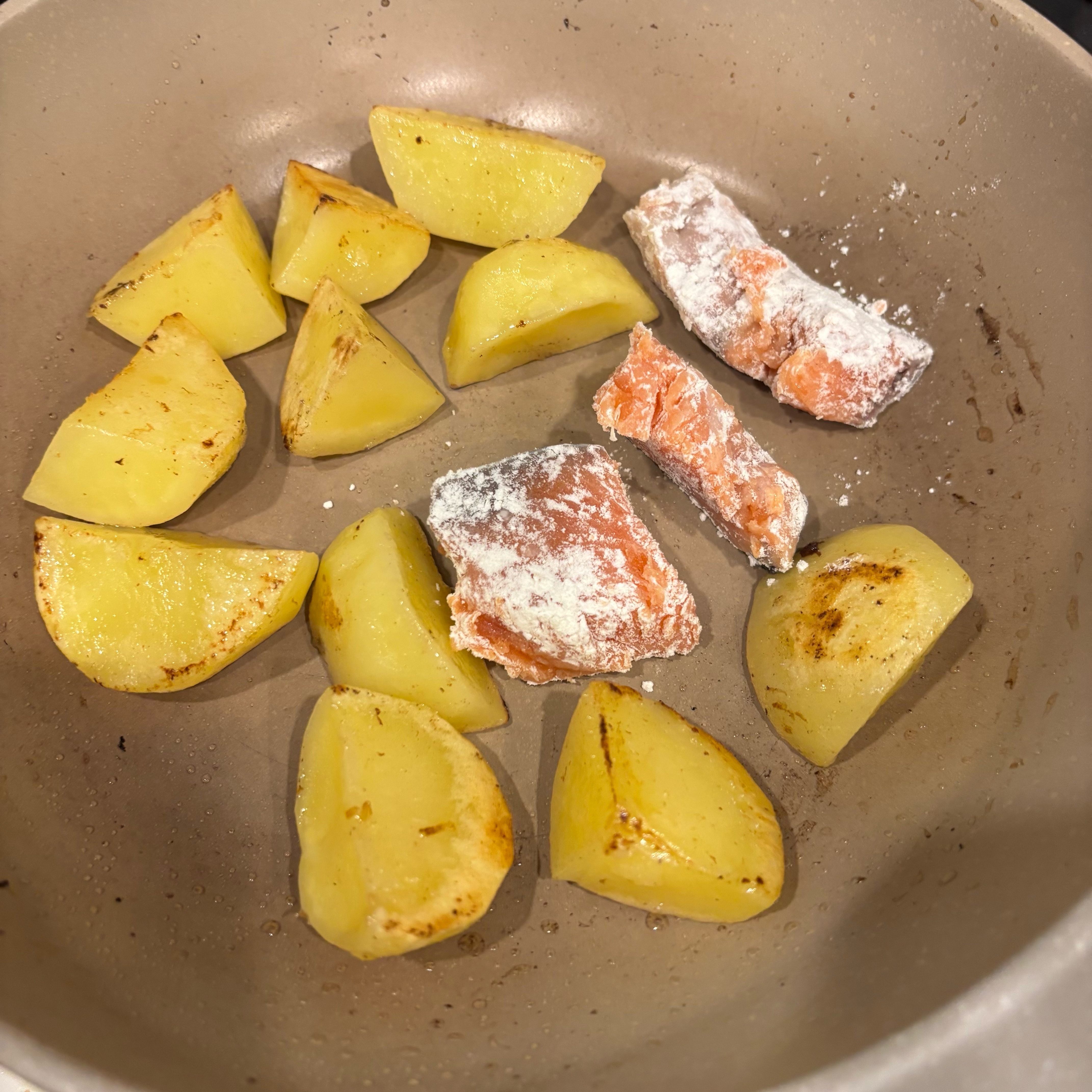 軽く焼き色がついたら薄力粉をまぶした鮭を加える